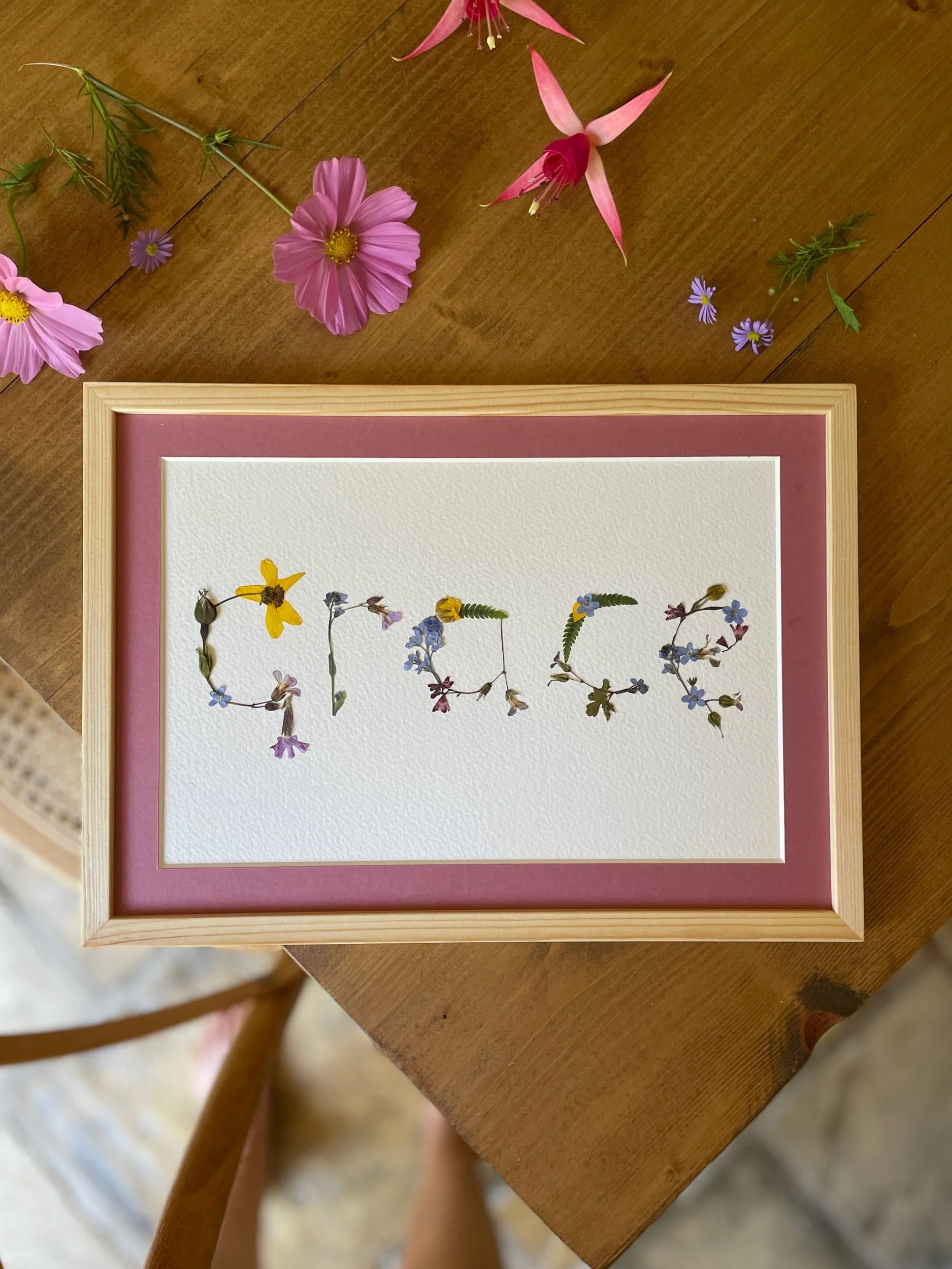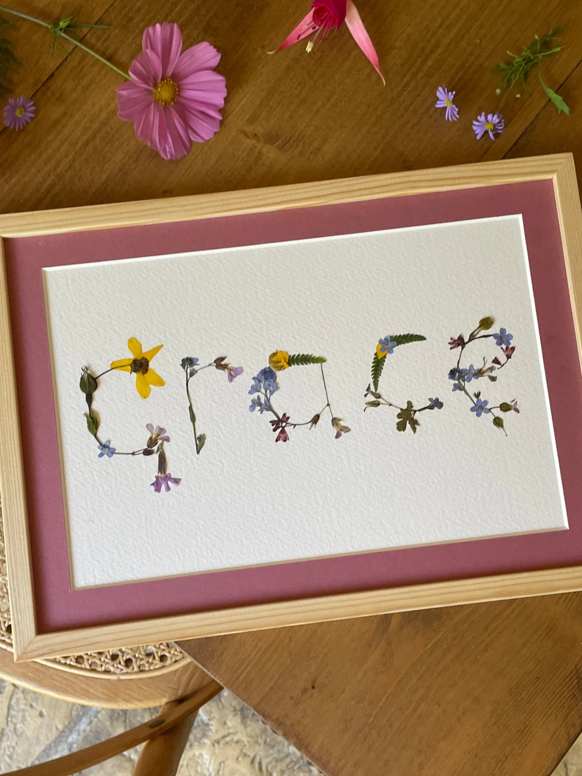 Original and bespoke name art made with my archive of pressed cottage garden and wild flowers. Each artwork is unique and your frame can include a mount if you’d like. I’m very happy to chat over your design before I make it.
